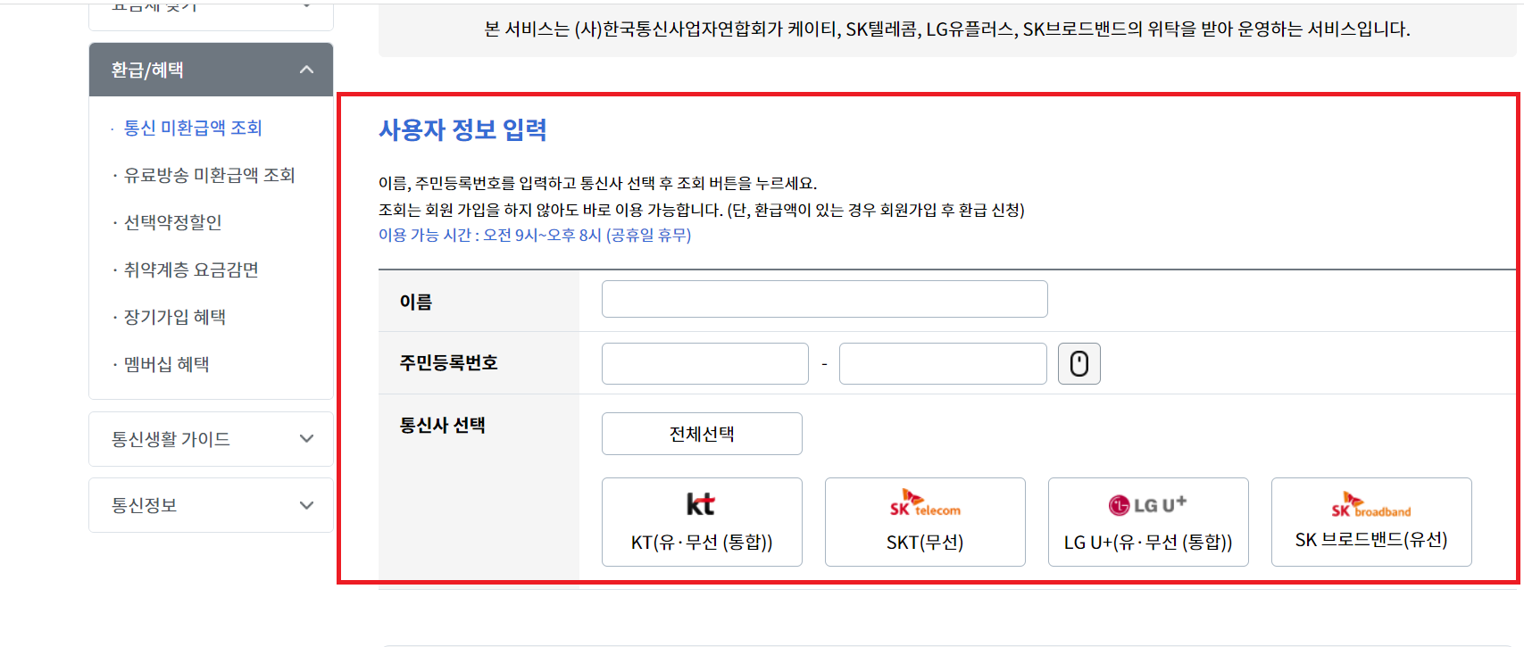 통신 미환급액 조회는 09:00 ~ 20:00