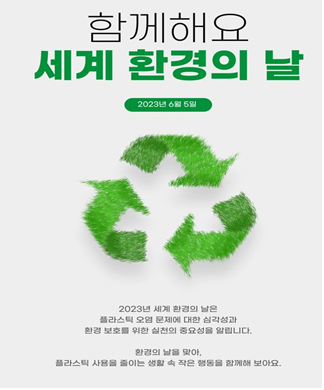 2023년 6월 5일, 세계 환경의 날 전 세계 공통 주제는 ‘플라스틱 오염 퇴치’이다. 나날이 심각해지는 플라스틱이 인류 최고의 발명품으로 시작했지만, 현재 수많은 환경 문제를 야기하고 있다. 플라스틱 사용을 줄이는 것과 플라스틱으로 오염된 지구의 환경을 깨끗하게 만들어 가기 위한 실천을 강조하여 우리 모두 스스로 지키는 ‘더 나은 미래를 위해, 지금부터 우리가’ 슬로건을 생활 속에서 실천해보자. 또한 환경의 날 주간을 통해 각 지역에서여러 행사가 진행 될 예정이다.
