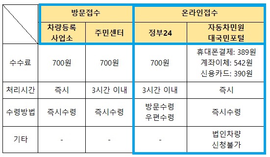 자동차민원 대국민포털에서는 개인차량만 신청가능하고 법인차량은 이용불가합니다.