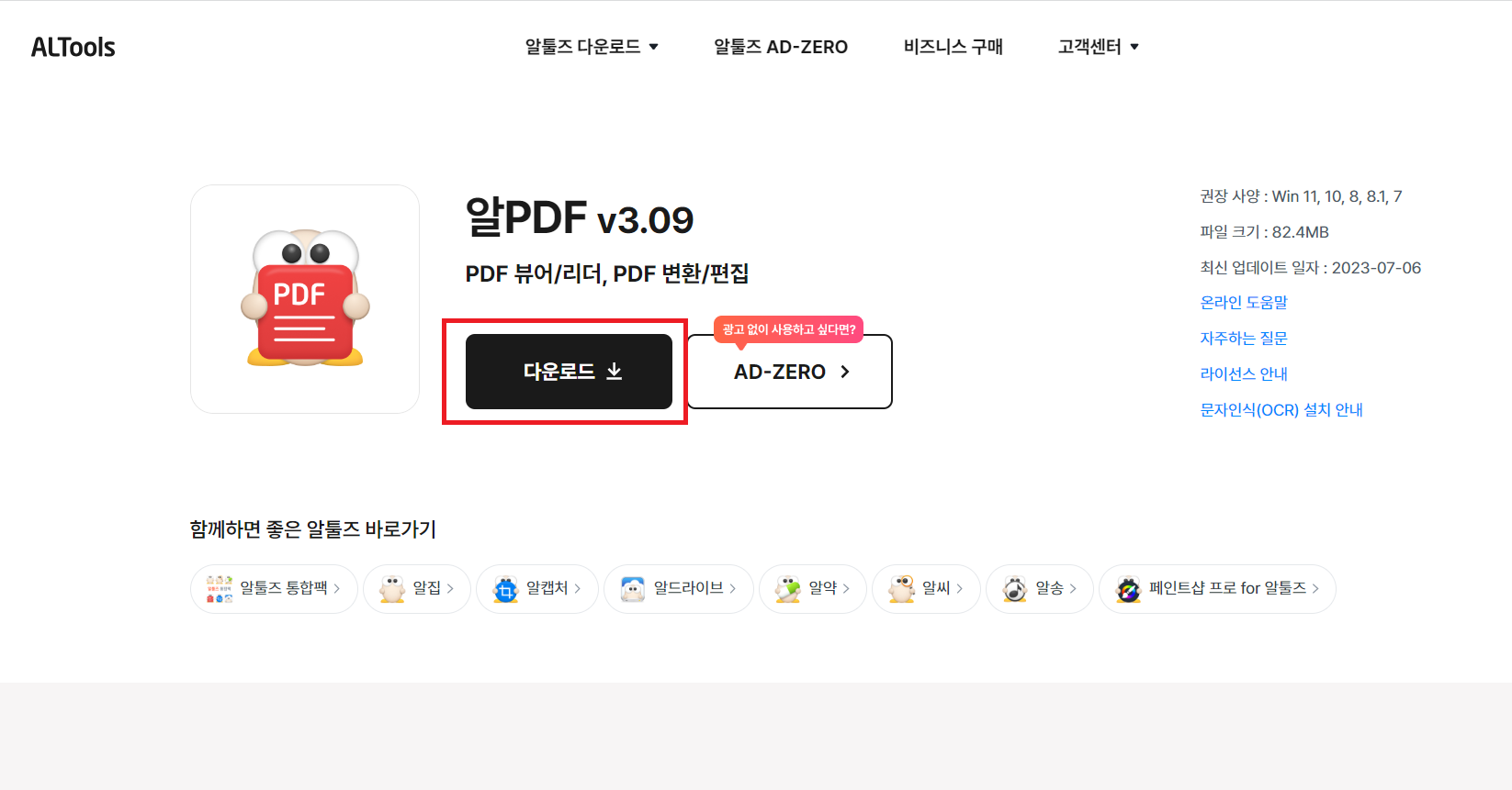 알툴즈 홈페이지가 아래와 같이 나오면, 알PDF를 눌러 주신 후에 설치를 진행합니다.